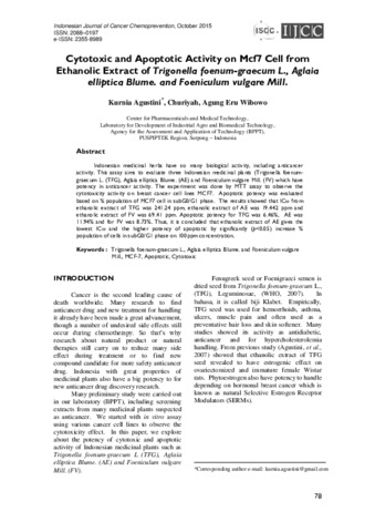 Agustini, Kurnia and Churiyah, Churiyah and Wibowo, Agung Eru (2015) Cytotoxic and Apoptotic Activity on Mcf7 Cell from Ethanolic extract of trigonella foenum-graecum L., aglaia elliptica blume. and foeniculum vulgare mill. Indonesian Journal of Cancer Chemoprevention, 6 (3). pp. 78-83. ISSN 2088-0197
