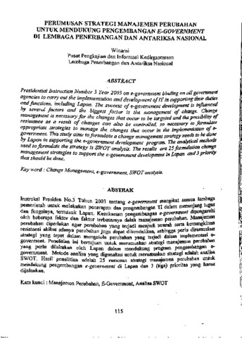 Instruksi Presiden No.3 Tahun 2003 tentang e-government mengikat semua Lembaga Pemerintah untuk melakukan penerapan dan pengembangan TI dalam menunjang tugas dan fungsinya, termasuk LAPAN. Kesuksesan pengembangan e-government dipengaruhi oleh beberapa faktor dan faktor terbesarnya adalah manajemen perubahan. Manajemen perubahan diperlukan agar perubahan yang terjadi menjadi terarah serta kemungkinan resistensi akibat adanya perubahan juga dapat dikendalikan, sehingga perlu dirumuskan strategi yang tepat dalam mengelola perubahan yang terjadi dalam implementasi e government. Penelitian ini bertujuan untuk merumuskan strategi manajemen perubahan yang perlu dilakukan oleh LAPAN dalam mendukung program pengembangan e-government. Metode analisa yang digunakan untuk merumuskan strategi adalah analisa SWOT. Hasil penelitian adalah 25 rumusan strategi manejemen perubahan untuk mendukung pengembangan e government di LAPAN.dan 3 (tiga) prioritas yang harus dijalankan.