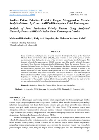 Muhamad, Dickiaulia and Rizky, Arif Nugroho and Mohtana, Karisma Kadri (2020) Analisis faktor prioritas produksi pangan menggunakan metode Analytical Hierarchy Process (AHP) di Kabupaten Kutai Kartanegara. Jurnal Penelitian Pertanian Terapan, 20 (3): 3. pp. 191-197. ISSN 1410-5020