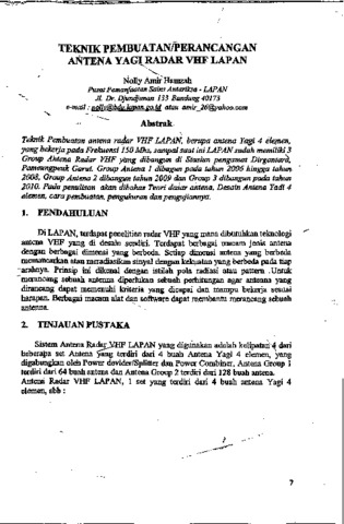 Teknik pembuatan antenna radar VHF LAPAN, berupa antenna Yagi 4 elemen, yang bekerja pada frekuensi 150 Mhz, sampai saat ini LAPAN sudah memiliki 3 Group Antena Radar VHF yang dibangun di Stasiun Pengamat Drgantara Pameungpeuk Garut. Group antenna 1 dibangun pada tahun 2006 hingga tahun 2008, group antenna 2 dibangun tahun 2009 dan group 3 dibangun pada tahun 2010. Pada penulisan akan dibahas teori dasar antenna, desain antenna Yagi 4 elemen, cara pembuatan, pengukuran dan pengujiannya.