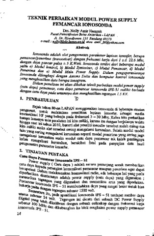 Ionosonda adalah alat pengamatan parameter lapisan ionosfer , berupa pemancar / penerima (transceiver) dengan frekuensi kerja dari 1 s.d. 22.6 Mhz, dengan daya pancar pulsa ± 5K.Watt. ionosonda terdiri dari beberapa modul yaitu a) Modul control, b) modul synthesizer, c) modul pemancar, d) modul penerima dan e) modul main power supply. Dalam pengoperasiannya ionosonda dilengkapi dengan antenna delta dan komputer control ionosonda yang menghasilkan data berupa ionogram. Dalam penulisan ini akan dibahas teknik perbaikan modul power supply (catu daya) pemancar, catu daya pemancar ionosonda IPS-51 sedikit berbeda dengan catu daya pada umumnya dan menghasilkan tegangan 1.5 KV