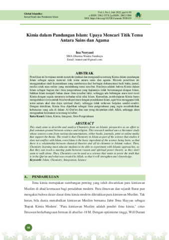 Ina, Noryani (2022) Kimia dalam pandangan Islam: upaya mencari titik temu antara sains dan agama. Jurnal Studi Islam dan Pemikiran Islam, 1 (1): 4. pp. 44-50. ISSN 2962-3588