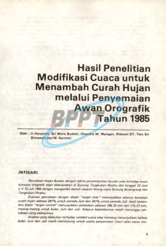 Percobaan Hujan Buatan dengan teknis penyemprotan larutan urea terhadap awan kumulus orografik telah dilaksanakan di Gunung Tangkuban Perahu dari tanggal 12 Juni s/d 13 Juli 1985 dengan mengambil daerah sasaran lereng utara Gunung Burangrang dan Tangkuban Perahu. Evaluasi percobaan dengan disain "target only" menunjukkan adanya kenaikan curah hujan sebesar 241% untuk periode Juni dan 261% untuk periode Juli. Hasil sementara disain "target control" menunjukkan perbedaan sebesar 188, 76 mm dan 115,37 mm, masing-masing untuk bulan Juni dan Juli. Adapun kepastiannya masih menunggu percobaan yang selanjutnya. Analisis yang dilakukan terhadap variabel cuaca atas memang menunjukkan bahwa bulan Juni dan Juli masih mendukung untuk usaha penyemaian fseed able) awan grafik. Monitor debit sungai di daerah sasaran memberikan petunjuk dengan tepat saat hujan turun. Hanya hujan yang berselang 0.5 — 2 jam setelah saat penyemprotan yang diduga sebagai hasil perlakuan terhadap awan di atas gunung, disamping kriteria lainnya. Pemantauan terhadap lingkungan dilaksanakan dengan menganalisis beberapa sampel (contoh) tanah dan air (badan air dan air hujan) yang diambil dari sekitar daerah percobaan. Hasilnya menunjukkan bahwa tidak ada perubahan yang menyebabkan pencemaran lingkungan. Dampak penyemprotan yang teriihat jelas adalah keguguran daun pada tumbuhan di sekitar lokasi menara. Namun sebenarnya secara vegetatif tumbuhan ini masih tetap hidup, karena dari pengamatan yang dilakukan 3 bulan setelah kegiatan penyemprotan, tampak tunas daun tumbuh kembali dengan subur.