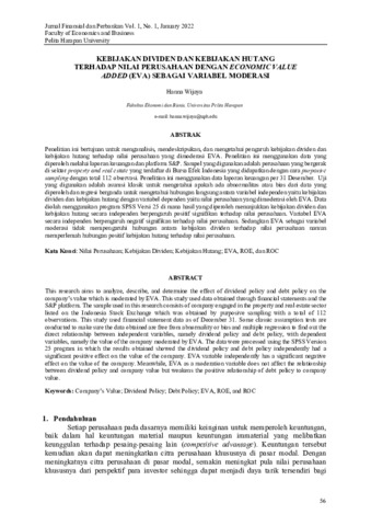 Hanna, Wijaya (2022) Kebijakan dividen dan kebijakan hutang terhadap nilai perusahaan dengan Economic Value Added (EVA) sebagai variabel moderasi. Jurnal Finansial dan Perbankan, 1 (1): 4. pp. 56-69. ISSN 2828-3872