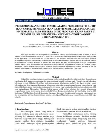 Festian, Cindarbumi Pengembangan model pembelajaran “Kolaboratif Aktif (KA)” untuk meningkatkan aktivitas belajar pelajaran matematika pada peserta didik program kejar paket C PKBM Ki Hajar Dewantara Kecamatan Ngronggot Kabupaten Nganjuk. Journal of Mathematics Education and Science, 1 (1): 3. pp. 15-20. ISSN 2621-1203