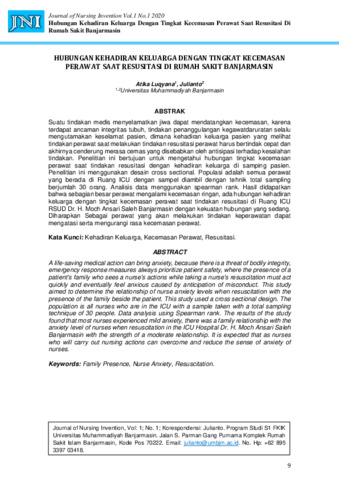 Atika Luqyana and Julianto (2020) Hubungan kehadiran keluarga dengan tingkat kecemasan perawat saat resusitasi di rumah sakit Banjarmasin. Journal of Nursing Invention, 1 (1): 2. pp. 9-15. ISSN 2828-481X