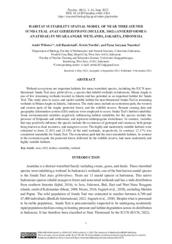 Andri Wibowo and Adi Basukriadi and Erwin Nurdin and Nana Suryana Nasution (2022) Habitat suitability spatial model of near threatened Sunda teal Anas gibberifrons (Muller, 1842) (Anseriformes: Anatidae) in Muara Angke wetlands, Jakarta, Indonesia. TREUBIA, 49 (1): 1. pp. 1-14. ISSN 0082-6340
