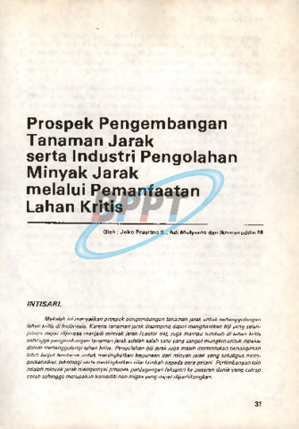 Makalah ini menyajikan prospek pengembangan tanaman jarak untuk penangguiangan lahan kritis di Indonesia. Karena tanaman jarak disamping dapat menghasilkan biji yang selan- jutnya dapat diproses menjadi minyak jarak (castor oil), juga mampu tumbuh di lahan kritis sehingga pengembangan tanaman jarak adalah salah satu yang sangat mungkin untuk dipakai dalam menanggulangi lahan kritis. Pengolahan biji jarak juga masih memerlukan penanganan lebih lanjut terutama untuk meningkatkan kegunaan dari minyak jarak yang sekaligus mem- perkenalkan teknologi serta meningkatkan nilai tambah kepada para petani. Pertimbangan lain adalah minyak jarak mempunyai prospek perdagangan (ekspor) ke pasaran dunia yang cukup cerah sehingga merupakan komoditi non migas yang dapat diperhitungkan.