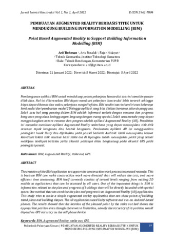 Arif, Rohman and Aris, Rinaldi and Fajar, Hidayat (2022) Pembuatan augmented reality berbasis titik untuk mendukung building information modelling (BIM). Jurnal Inovasi Konstruksi (JIK), 1 (1): 3. pp. 19-24. ISSN 2961-7804