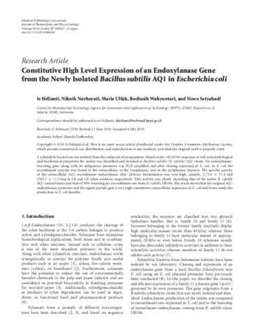 Helianti, Is and Nurhayati, Niknik and Maria, Ulfah and Budiasih, Wahyuntari and Siswa, Setyahadi (2010) Constitutive high level expression of an endoxylanase gene from the newly isolated bacillus subtilis AQ1 in escherichia coli. Journal of Biomedicine and Biotechnology: 980567. pp. 1-12. ISSN 2642-9128