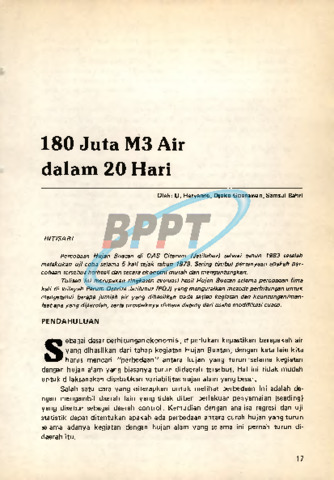 Percobaan hujan buatan di DAS Citarum (Jatiluhur) selesai tahun 1983 setelah melakukan uji coba selama 5 kali sejak tahun 1979. Sering timbul pertanyaan apakah percobaan tersebut berhasil dan secara ekonomi murah dan menguntungkan. Tulisan ini merupakan ringkasan evaluasi hasil hujan buatan selama percobaan lima kali di wilayah Perum Otorita Jatiluhur (POJ) yang menguraikan metode perhitungan untuk mengetahui berapa jumlah air yang dihasilkan pada setiap kegiatan dan keuntungan/manfaatapa yang diperoleh, serta prospeknya dimasa datang dari usaha modifikasi cuaca.