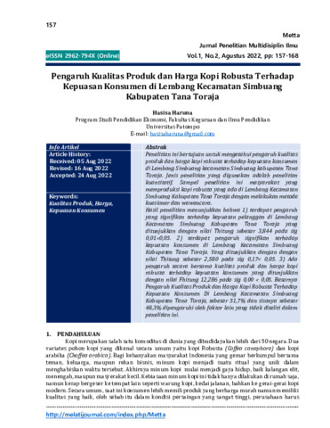 Hasisa Haruna (2022) Pengaruh kualitas produk dan harga kopi robusta terhadap kepuasan konsumen di Lembang Kecamatan Simbuang Kabupaten Tana Toraja. Jurnal Penelitian Multidisiplin Ilmu, 1 (2): 13. pp. 157-168. ISSN 2962-794X