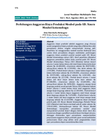 Sitty, Sherihulla Mokoagow (2022) Perhitungan anggaran biaya produksi meubel pada UD. Naura Meubel Kotamobagu. Metta Jurnal Penelitian Multidisiplin Ilmu, 1 (2): 7. pp. 175-192. ISSN 2962-794X