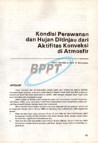 Awan Cumulus dan Cumulonimbus adalah salah satu manifestasi adanya aktifitas konvektif dalam atmosfir. Indonesia yang terletak di daerah tropis, lebih dari 60% jumlah per- awanannya terdiri dari awan-awan jenis ini (BMG, 1980) dengan sebagian besar hujan yang jatuh dihasilkan oleh jenis awan inijuga. Dalam tulisan ini dicoba untuk mengembangkan dan menerapkan metoda Convective- Cell (Beers, 1973), yang merupakan model fisika matematika untuk menghitung indeks kon vektifitas atmosfir dengan menggunakan data radiosonde. Dari penelitian untuk lapisan atmosfir atas yang diperoleh dari pengukuran radiosonde di Tangkuban Perahu (12 s/d 16 Juni 1985) dan Bandung (16 s/d 20 Oktober 1987) didapatkan bahwa: 1. Pada hari-hari hujan cukup banyak (12 dan 13 Juni 1985 dan 18 s/d 20 Oktober 1987) bersesuaian dengan kondisi atmosfir stabil lemah sampai netral dengan harga indeks konvektifitas negatif kecil (mendekat ke nol). 2. Pada hari-hari tidak ada/sedikit hujan (14 s/d 16 Juni 1985 dan 16 dan 17 Oktober 1987) bersesuaian dengan kondisi atmosfir stabil kuat, dengan harga indeks konvektifitas negatif besar.