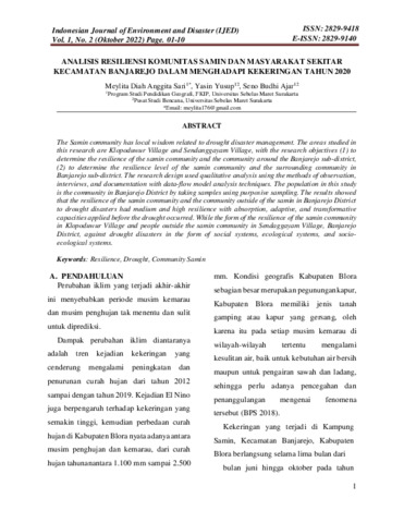 Meylita, Diah Anggita Sari and Yasin, Yusup and Seno, Budhi Ajar (2022) Analisis resiliensi komunitas Samin dan masyarakat sekitar Kecamatan Banjarejo dalam menghadapi kekeringan tahun 2020. Indonesian Journal of Environment and Disaster, 1 (2): 1. pp. 1-10. ISSN 2829-9418