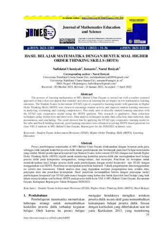 Nafidatul, Ulumiyah and Ismanto, Ismanto and Nurul, Ilmiyah (2022) Hasil belajar matematika dengan bentuk soal Higher Order Thinking Skills (HOTS). Journal of Mathematics Education and Science, 5 (1): 4. pp. 31-36. ISSN 2621-1203