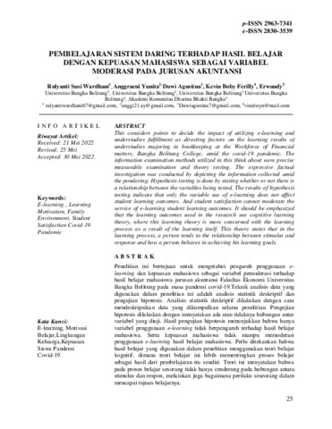 Rulyanti, Susi Wardhani and Anggraeni, Yunita and Duwi, Agustina and Kevin, Boby Ferilly and Erwandy, Erwandy (2022) Pembelajaran sistem daring terhadap hasil belajar dengan kepuasan mahasiswa sebagai variabel moderasi pada jurusan akuntansi. AKDBB Journal of Economics and Business (AJEB), 1 (1): 3. pp. 25-35. ISSN 2963-7341
