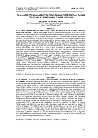 Dwi, Irwanti and Sri, Agustin and Hanifa, - (2019) Evaluasi perencanaan strategis tingkat Kedeputian Badan Tenaga Nuklir Nasional Tahun 2015-2019. In: Seminar Nasional Infrastruktur Energi Nuklir 2019, 10 Oktober 2019, Pontianak.