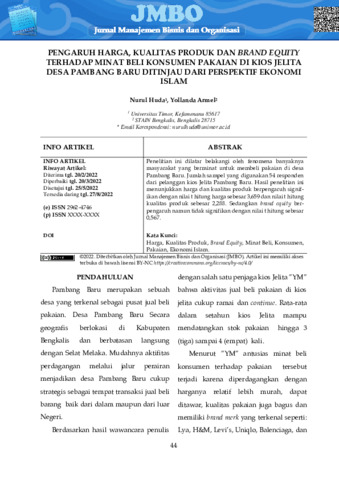 Nurul, Huda and Yollanda, Armel (2022) Pengaruh harga, kualitas produk dan brand equity terhadap minat beli konsumen pakaian di kios jelita desa Pambang baru ditinjau dari perspektif ekonomi islam. Jurnal Manajemen Bisnis dan Organisasi, 1 (1): 6. pp. 44-50. ISSN 2961-8312
