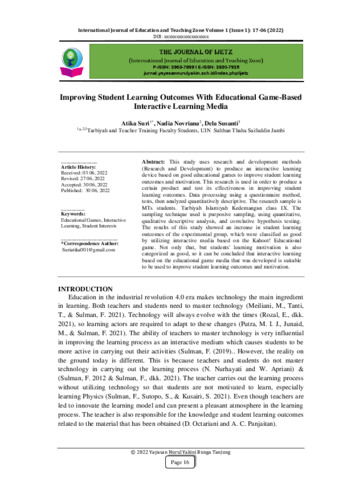 Atika, Suri and Nadia, Novriana and Dela, Susanti (2022) Improving student learning outcomes with educational game-based interactive learning media. International Journal of Education and Teaching Zone, 1 (1): 3. pp. 16-19. ISSN 2963-7899