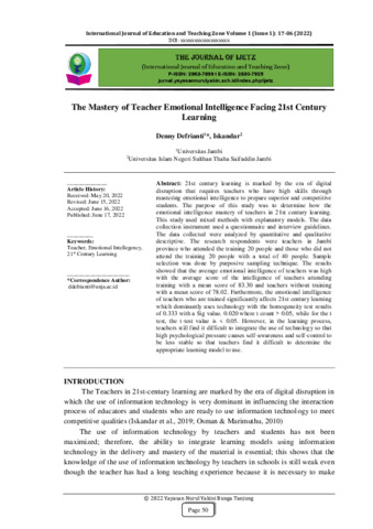 Denny, Defrianti and Iskandar, Iskandar (2022) The Mastery of teacher emotional intelligence facing 21st century learning. International Journal of Education and Teaching Zone, 1 (1): 8. pp. 50-59. ISSN 2963-7899