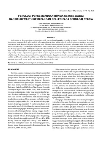 Janis, Damaiyani and Destario, Metusala (2011) Fenologi perkembangan bunga Centella asiatica dan studi waktu kematangan pollen pada berbagai stadia. Berkala Penelitian Hayati, Edisi khusus, 7A (-). pp. 75-78. ISSN 0852-6834
