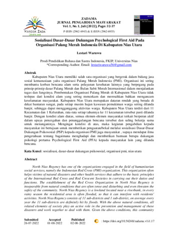 Lestari, Waruwu (2022) Sosialisasi dasar-dasar dukungan psychological first aid pada oganisasi Palang Merah Indonesia di Kabupaten Nias Utara. ZADAMA Jurnal Pengabdian Masyarakat, 1 (1): 6. pp. 32-37. ISSN 2962-6943
