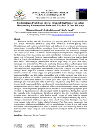 Miftakhur, Rohmah and Rafika, Rahmadani and Khafid, Nurul (2022) Pendampingan pendidikan literasi financial bagi orang tua dalam membendung konsumerisme pada anak usia dini di Desa Sukaraja. ZADAMA Jurnal Pengabdian Msyarakat, 1 (1): 13. pp. 81-84. ISSN 2962-6943