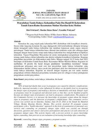 Rini, Febrianti and Mastiur, Butar Butar and Faradita, Wahyuni (2022) Penyuluhan tanda bahaya kehamilan pada ibu hamil di Kelurahan Tanah Enam Ratus Kecamatan Medan Marelan Kota Medan. ZADAMA Jurnal Pengabdian Masyarakat, 1 (1): 7. pp. 38-43. ISSN 2962-6943