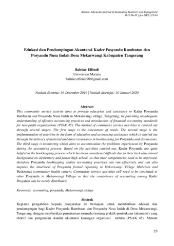 This community service activity aims to provide education and assistance to Kader Posyandu Rambutan and Posyandu Nusa Indah in Mekarwangi village, Tangerang, by providing an adequate understanding of effective accounting practices and introduction of financial accounting standards for non-profit organizations (PSAK 45). The method of community service activities is carried out through several stages. The first stage is the assessment of needs. The second stage is the implementation of activities in the form of education and accounting assistance which is carried out through the delivery of material and direct assistance in bookkeeping for Posyandu and discussions. The third stage is monitoring which aims to accommodate the problems experienced by Posyandu during the accounting process. Based on the activities carried out, Kader Posyandu are quite helpful in the bookkeeping process which has been considered difficult due to their lack educational background on elementary and junior high school,so that their competencies need to be improved, therefore Posyandu bookkeeping and/or accounting practices can run effectively and can also improve the timeliness of Posyandu formal reporting to Mekarwangi Village Midwives and Puskesmas (community health center). Community service activities still need to be continued to other Posyandu in Mekarwangi Village so that the competence of accounting among Kader Posyandu can be evenly distributed.