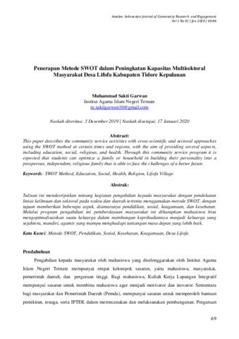 Muhammad, Sakti Garwan (2020) Penerapan metode SWOT dalam peningkatan kapasitas multisektoral masyarakat Desa Lifofa Kabupaten Tidore Kepulauan. Amalee: Indonesian Journal of Community Research and Engagement, 1 (1): 7. pp. 69-86. ISSN P-ISSN 2715-7997, E-ISSN 2716-0750