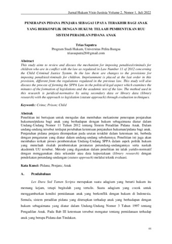 Trias, Saputra (2022) Penerapan pidana penjara sebagai upaya terakhir bagi anak yang berkonflik dengan hukum: Telaah pembentukan RUU Sistem Peradilan Pidana Anak. Jurnal Hukum Visio Justisia, 2 (1): 4. pp. 44-58. ISSN 2807-1980