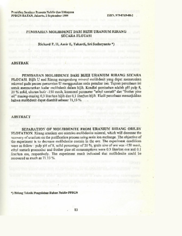 Bijih U asal Rirang mengandung mineral molibdenit yang dapat menurunkan rekoveri pada proses pemurnian U menggunakan resin penukar ion. Tujuan percobaan ini untuk menurunkan kadar molibdenit dalam bijih. Kondisi pemisahan adalah pH pulp 8, 20 % solid, ukuran butir -150 mesh, konsumsi parameter "ethyl xantath" dan "frother pine oil" masing-masing 0,3 liter/ton bijih dan 0,1 liter/ton bijih. Hasil percobaan menunjukkan bahwa molibdenit dapat diambil sebesar 71,13 %.