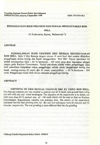 Sri, Sudaryanto and Sujono, Sujono and Muhammad, Muhammad (1998) Penggilingan bijih uranium eko remaja menggunakan rod mill. In: Prosiding Seminar Pranata Nuklir dan Litkayasa, PPBGN-BATAN.