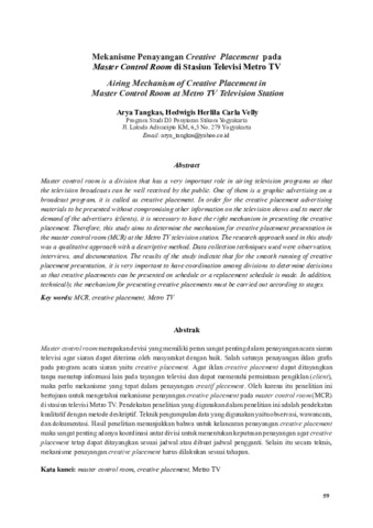 Arya, Tangkas and Hedwigis, Herlila Carla Velly (2021) Mekanisme penayangan creative placement pada master control room di stasiun televisi Metro TV. Jurnal Ilmiah Multimedia dan Komunikasi, 6 (2): 1. pp. 59-68. ISSN p-ISSN 2541-2086, e-ISSN 2776-0006