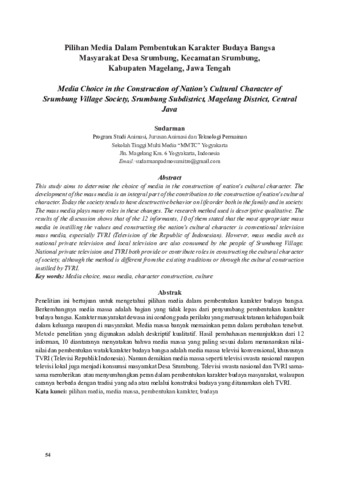 Penelitian ini bertujuan untuk mengetahui pilihan media dalam pembentukan karakter budaya bangsa. Berkembangnya media massa adalah bagian yang tidak lepas dari penyumbang pembentukan karakter budaya bangsa. Karakter masyarakat dewasa ini condong pada perilaku yang merusak tatanan kehidupan baik dalam keluarga maupun di masyarakat. Media massa banyak memainkan peran dalam perubahan tersebut. Metode penelitian yang digunakan adalah deskriptif kualitatif. Hasil pembahasan menunjukkan dari 12 informan, 10 diantaranya menyatakan bahwa media massa yang paling sesuai dalam menanamkan nilai nilai dan pembentukan watak/karakter budaya bangsa adalah media massa televisi konvensional, khususnya TVRI (Televisi Republik Indonesia). Namun demikian media massa seperti televisi swasta nasional maupun televisi lokal juga menjadi konsumsi masyarakat Desa Srumbung. Televisi swasta nasional dan TVRI sama sama memberikan atau menyumbangkan peran dalam pembentukan karakter budaya masyarakat, walaupun caranya berbeda dengan tradisi yang ada atau melalui konstruksi budaya yang ditanamkan oleh TVRI