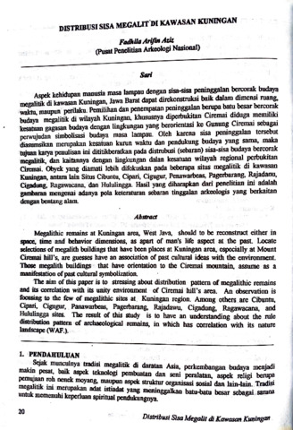 Aspek kehidupan manusia masa lampau dengan sisa-sisa peninggalan bercorak budava megalitik di kawasan Kuningan, Jawa Barat dapat direkonstruksi baik dalam dimensi ruang, waktu, maupun perilaku. Pemilihan dan penempatan peninggalan berupa batu besar bercorak budaya megalitik di wilayah Kuningan, khususnya diperbukitan Ciremai diduga memiliki kesatuan gagasan budaya dengan lingkungan yang berorientasi ke Gunung Ciremai sebagai perwujudan simbolisasi budaya masa lampau. Oleh karena sisa peninggalan tersebut diasumsikan merupakan kesatuan kurun waktu dan pendukung budaya yang sama, maka tujuan karya penulisan ini dititikberatkan pada distrubusi (sebaran) sisa-sisa budaya bercorak megalitik, dan kaitannya dengan lingkungan dalan kesatuan wilayah regional perbukitan Ciremai. Obyek yang diamati lebih difokuskan pada beberapa situs megalitik di kawasan Kuningan, antara lain Situs Cibuntu, Cipari, Cigugur, Penawarbeas, Pagerbarang, Rajadanu, Cigadung, Ragawacana, dan Hululingga. Hasil yang diharapkan dari penelitian ini adalah gambaran mengenai adanya pola keteraturan sebaran tinggalan arkeologis yang berkaitan dengan bentang alam.