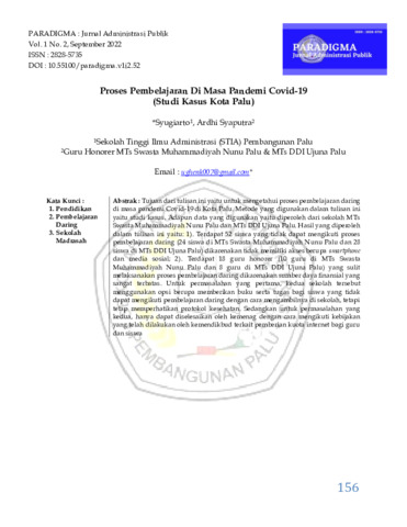 Syugiarto, Syugiarto and Ardhi, Syaputra (2022) Proses pembelajaran di masa pandemi Covid-19 (studi kasus Kota Palu). Paradigma: Jurnal Administrasi Publik, 1 (2): 5. pp. 157-164. ISSN 2828-5735