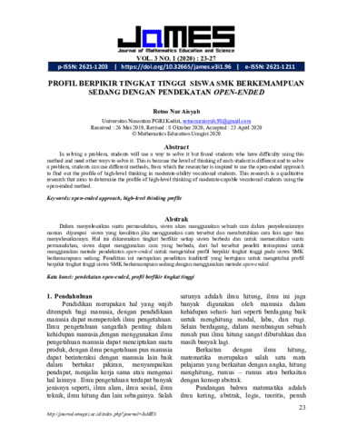 Retno, Nur Aisyah (2020) Profil berpikir tingkat tinggi siswa SMK berkemampuan sedang dengan pendekatan open-ended. Fakultas Keguruan dan Ilmu Pendidikan, Journal of Mathematics Education and Science, 3 (1): 4. pp. 23-27. ISSN 2621-1203