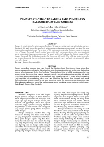 M. Supriyono, M. Supriyono and Erie, Hidayat Sukriadi (2022) Pemanfaatan ikan barakuda pada pembuatan batagor (baso tahu goreng). Jurnal Manner, 1 (2): 3. pp. 73-77. ISSN 2828-3767