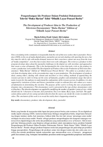 Maria, Esfera Dyah Untari and Siti, Asiatun (2021) Pengembangan ide produser dalam produksi dokumenter televisi “Buku Harian” edisi “Dibalik Layar Pencari Berita”. Jurnal Ilmiah Multimedia dan Komunikasi, 6 (1): 4. pp. 28-46. ISSN 2541-2086, e-ISSN 2776-0006
