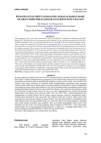 Tirta, Mulyadi and Suci, Permata Sari (2022) Pemanfaatan siput gonggong sebagai bahan baku olahan sosis sebagai makanan khas Kota Batam. Jurnal Manner, 1 (2): 4. pp. 78-86. ISSN 2828-3767