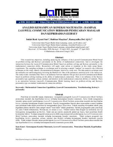 Indah, Resti Ayuni Suri and Ruhban, Masykur and Ramayudha, Dwi Aji G. (2021) Analisis kemampuan koneksi matematis : dampak lasswell communication berbasis pemecahan masalah dan kepribadian keirsey. Journal of Mathematics Education and Science, 4 (1): 2. pp. 7-14. ISSN 2621-1203