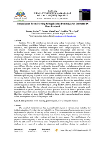 Yessica Siagian and Guntur Maha Putra and Arridha Zikra Syah (2022) Pemanfaatan zoom meeting sebagai solusi pembelajaran interaktif di masa pandemi. Zadama : Jurnal Pengabdian Masyarakat, 1 (1): 11. pp. 69-75. ISSN 2962-6943
