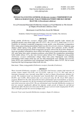 Eceng gondok (Eichhornia crassipes) sebagai pakan alternatif memiliki kadar mineral dan kandungan protein yang cukup tinggi yaitu 9,8–12,0 %, abu 11,9–23,9 %, lemak kasar 1,1–3,3 %. Penelitian ini bertujuan mengetahui penggunaan eceng gondok yang difermentasi menggunakan EM-4 dalam pakan terhadap pertumbuhan benih ikan nila (Oreochromis niloticus). Perlakuan yang diujikan adalah tepung eceng gondok terfermentasi dengan dosis perlakuan A=30%, B=40%, C=50%. Data hasil pengamatan diolah menggunakan program software Ms Excel 2010, Minitab 16. Hasil dari penelitian menunjukkan dosis terbaik dari tepung eceng gondok terfermentasi sebanyak 40% pada bahan baku pakan merupakan perlakuan yang terbaik dan menghasilkan pertumbuhan bobot mutlak sebesar 3,32 g dan rasio konversi pakan sebesar 0,41. Penggunaan eceng gondok (Eichhornia crassipes) terfermentasi sebagai bahan baku pakan berpengaruh nyata terhadap pertumbuhan bobot mutlak benih ikan nila dan tidak berpengaruh nyata terhadap rasio konversi pakan (FCR) serta memberikan hasil kelangsungan hidup berkisar antara 50-52%. Hal ini masih tergolong baik bagi kelangsungan hidup benih ikan nila.