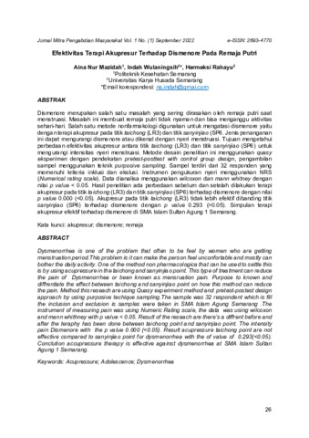 Aina Nur Mazidah and Indah Wulaningsih and Hermeksi Rahayu (2022) Efektivitas terapi akupresur terhadap dismenore pada remaja putri. Jurnal Mitra Pengabdian Masyarakat, 1 (1): 5. pp. 26-38. ISSN 2962-4770