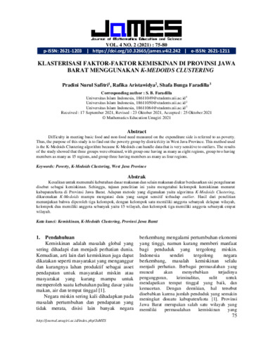 Pradini Nurul Safitri and Rafika Aristawidya and Shafa Bunga Faradilla (2021) Klasterisasi faktor-faktor kemiskinan di Provinsi Jawa Barat menggunakan k-medoids clustering. Journal of Mathematics Education and Science, 4 (2): 4. pp. 75-80. ISSN 2621-1203