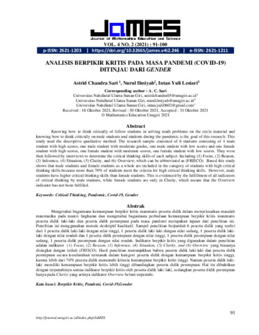 Astrid Chandra Sari and Nurul Ilmiyah and Intan Yuli Lestari (2021) Analisis berpikir kritis pada masa pandemi (Covid-19) ditinjau dari gender. Journal of Mathematics Education and Science, 4 (2): 6. pp. 91-100. ISSN 2621-1203