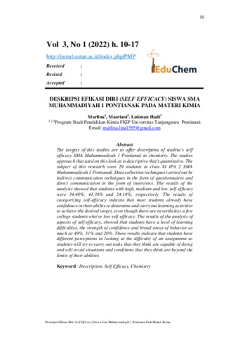 Marlina, Marlina and Masriani, Masriani and Lukman, Hadi (2022) Deskripsi efikasi diri (self efficacy) siswa SMA Muhammadiyah 1 Pontianak pada materi kimia. EduChem, 3 (1). pp. 10-17. ISSN 2775-4758
