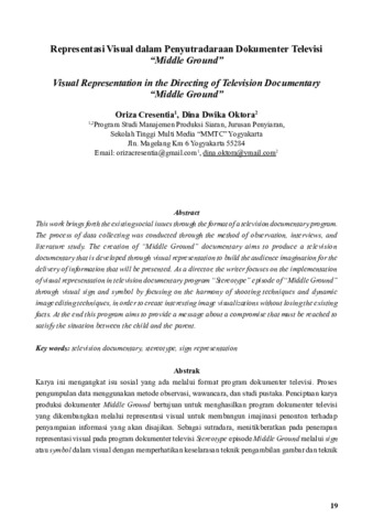 Oriza, Cresentia and Dina, Dwika Oktora (2022) Representasi visual dalam penyutradaraan dokumenter televisi “Middle Ground”. Jurnal Ilmiah Multimedia & Komunikasi, 7 (1): 2. pp. 19-32. ISSN p-ISSN 2541-2086, e-ISSN 2776-0006
